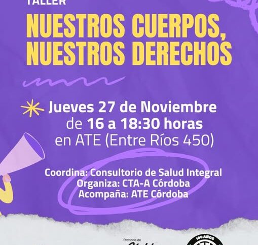 “Este 27 de noviembre, de 16 a 18:30 horas, te invitamos a compartir un espacio de reflexión, cuidado y construcción colectiva en ATE Córdoba (Entre Ríos 450) mediante el Taller ‘Nuestros cuerpos, nuestros derechos’. “Porque defender nuestros cuerpos y nuestras…