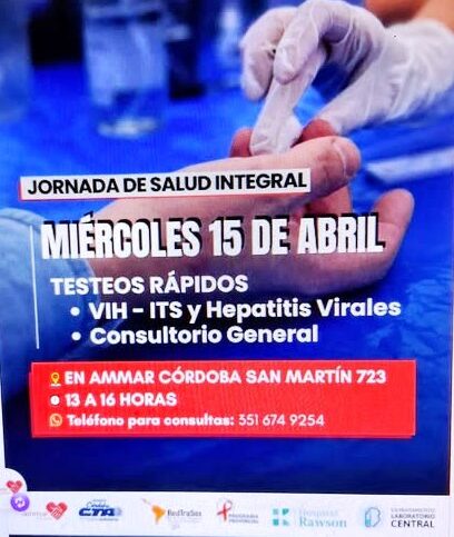 Publicado by CTA Autónoma Córdobaen abril 14, 2026abril 11, 2026 Salud Integral en AMMAR Córdoba-CTAA Este miércoles 15 de abril te esperamos con: Testeos rápidos de: VIH, ITS y Hepatitis Virales. Consultorio Integral. Dirigido a toda la comunidad, es voluntario, gratuito y confidencial. Agenda Miércoles 15 de abril. ⏲️ 13 a 16 horas. San Martín…