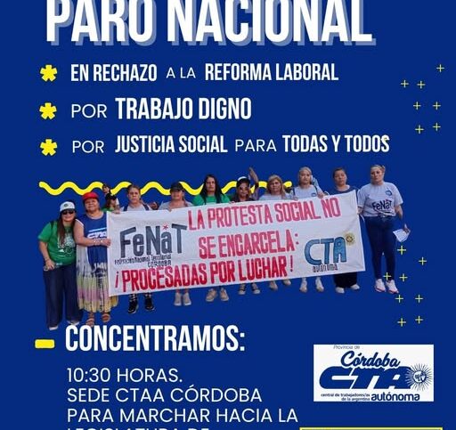 La CTA Autónoma Córdoba avisó que este jueves 18 de diciembre participará de la Jornada Nacional de Protesta y marchará a la Legislatura bajo las consignas: “El rechazo a la Reforma Laboral; Por trabajo digno; Por Justicia Social para todos…