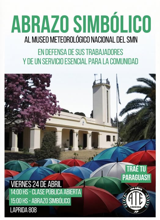 Este viernes 24 de abril, nos convocamos en un abrazo simbólico al Museo Meteorológico Nacional del SMN. En tiempos donde se intenta desfinanciar lo público, nos unimos para proteger un servicio que es esencial para toda la comunidad y para respaldar a sus trabajadores y trabajadoras.