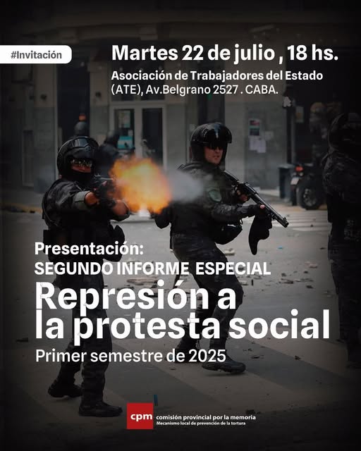 Este martes 22 de julio a las 18 horas, en el Anfiteatro “Eva Perón” de la Asociación Trabajadores del Estado (ATE-CTAA), Avenida Belgrano 2527 de la Ciudad Autónoma de Buenos Aires, la Comisión Provincial por la Memoria (CPM) presentará el Segundo Informe Especial “Represión a la Protesta Social”, primer semestre 2025.