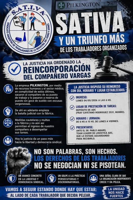 “Desde SATIVA lo decimos con firmeza: No son palabras, son hechos. No son promesas, son resultados. Vamos a seguir estando donde hay que estar: Al lado de cada trabajador que decida pelear. Somos un sindicato nacido en el dolor, fortalecido en la lucha”, redondea la nota.