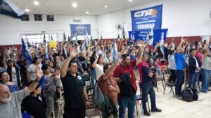 Leandro Sánchez relató a su vez los procesos de criminalización de la protesta que se dieron desde el 2024 en Misiones que lo tiene entre los 24 referentes judicializados en la provincia por reclamar mejores salarios. ‘Si creen que nos van a callar porque nos amenazan con meternos presos o judicializarnos, la verdad es que están muy equivocados, porque acá está la respuesta: Los compañeros que dicen “Vamos a seguir trabajando”. Y hay una cosa que nosotros repetimos siempre, es que no nos vamos a callar porque lo que andamos buscando no lo tenemos’.