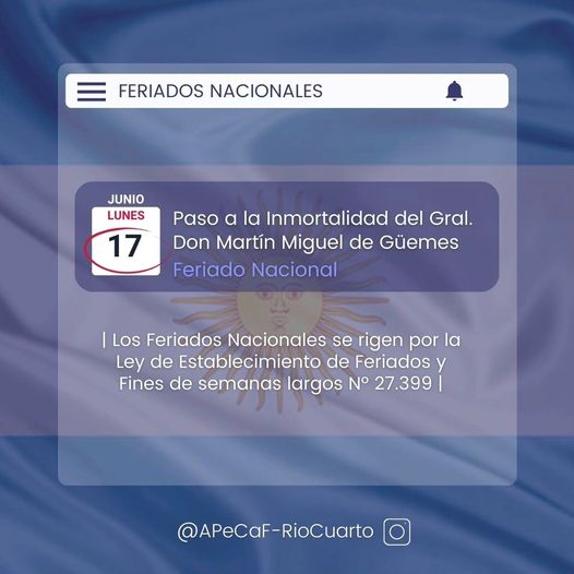 “Los Feriados Nacionales se rigen por la Ley de Establecimiento de Feriados y Fines de semanas largos Nº 27.399”, indica un comunicado gremial de APECAF-CTAA.