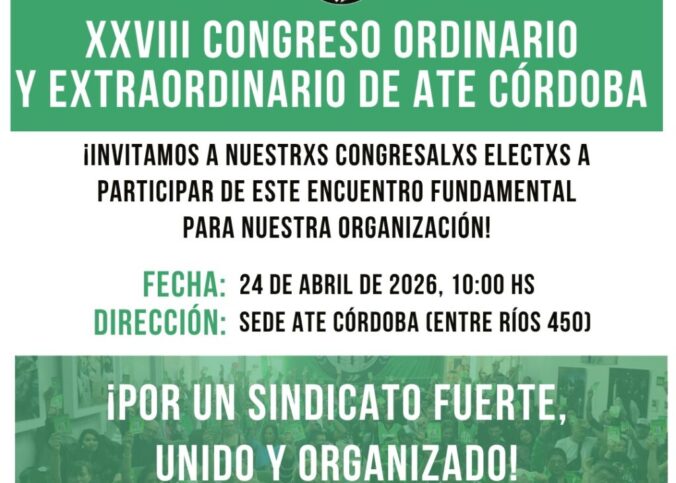 Este viernes 24 de abril se realizará el XXVIII Congreso Ordinario y Extraordinario de ATE Córdoba. El cónclave se llevará a cabo en la sede del Consejo Directivo Provincial (CDP), Entre Ríos 450, Córdoba Capital, a partir de las 10…