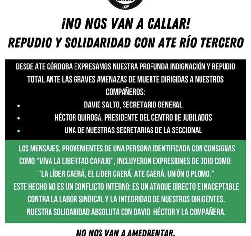 “Desde ATE Córdoba expresamos nuestro total repudio a las gravísimas amenazas de muerte recibidas por los compañeros de la Seccional ATE Río Tercero, entre ellos, el Secretario General, David Salto; el Presidente del Centro de Jubilados, Héctor Quiroga; y una…