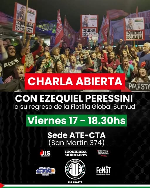 Este viernes a la tarde, con la organización del Frente de Izquierda, ATE, la CTA Autónoma Regional Río Cuarto y la Federación Nacional Territorial (FeNaT-CTAA), tendrá lugar una charla abierta con el militante riocuartense de Izquierda Socialista, Ezequiel Peressini, a su regreso de la misión humanitaria en Flotilla Global Sumud en solidaridad con la Causa Palestina.