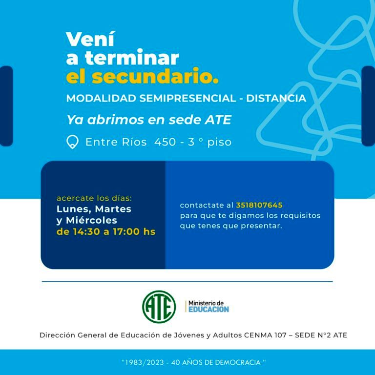 Con una convocatoria pública a las y los afiliados y no afiliados, la escuela para adultos CENMA 107, sede Nº2, llama a los interesados a inscribirse en la nueva modalidad semipresencial y a distancia del ciclo “Vení a terminar el secundario”.