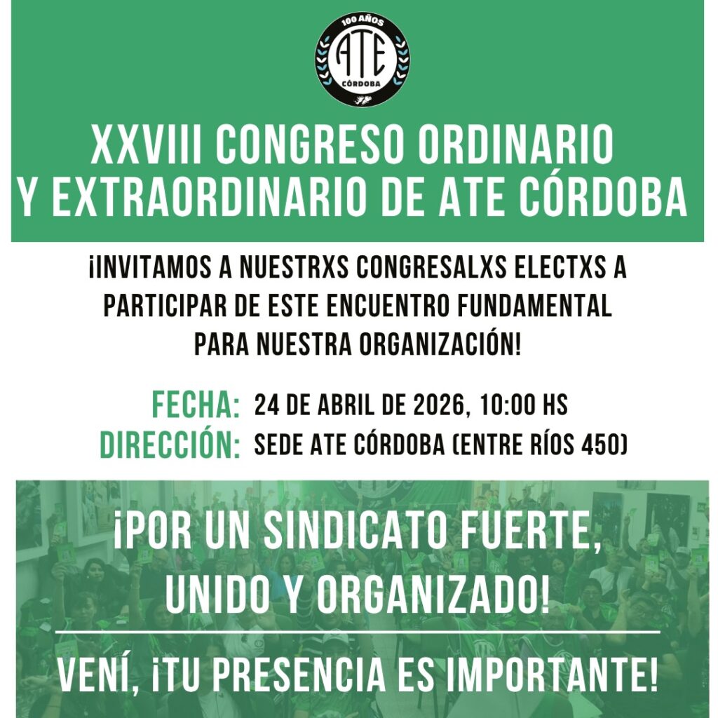 Este viernes 24 de abril se realizará el XXVIII Congreso Ordinario y Extraordinario de ATE Córdoba.