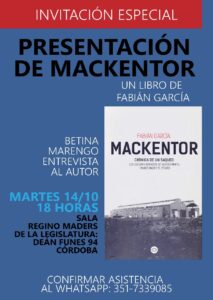 Este martes 14 de octubre, a las 18 horas, en la sala Regino Maders de la Legislatura Histórica de Córdoba (Deán Funes 94, Córdoba Capital), se presentará el libro “Mackentor. Crónica de un saqueo (Los oscuros negocios de Supercemento, Franco Macri y la dictadura”, escrito por Fabián García (foto de portada) y publicado por Editorial Recovecos. Durante la presentación, la periodista Betina Marengo entrevistará al autor.