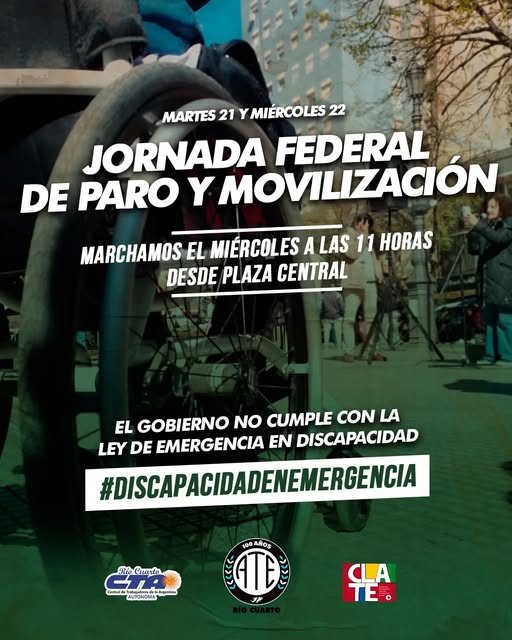 ATE y la CTA Autónoma Regional Río Cuarto se sumaron a la convocatoria a una concentración y marcha este miércoles 22 de octubre en la Plaza Central a partir de las 11 horas en el marco de la Jornada Federal de Paro y Movilización.