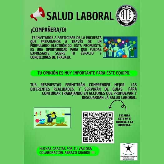 “Desde la Secretaría de Salud Laboral del Consejo Directivo Provincial (CDP) de ATE Córdoba, te invitamos a colaborar con esta información sumamente valiosa para generar políticas sobre la salud de las y los trabajadores.
