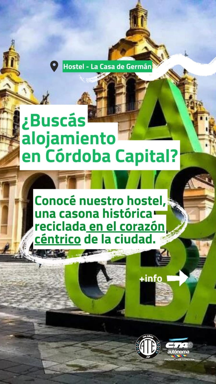 “La Casa de Germán” el hostel de ATE Córdoba es una casona histórica reciclada, se accede por escaleras al primer piso, ubicada en el corazón del centro de la ciudad Capital de la provincia.
