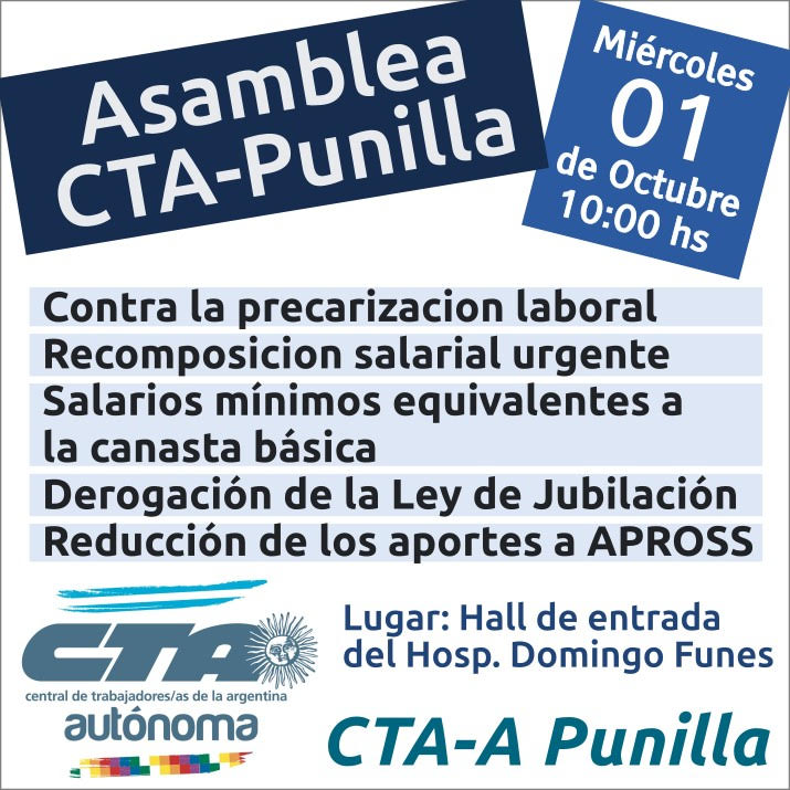 La Central de Trabajadores de la Argentina Autónoma (CTAA) Regional Punilla, convoca a una Asamblea General este miércoles 1º de octubre, a las 10:00 horas, en el Hall de entrada del Hospital Domingo Funes de la localidad de Santa María.