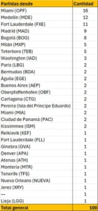 Pudiéndose observar en la tabla que sigue al siguiente cuadro, donde se resumen las partidas de los vuelos, las fechas y destinos de esos 100 vuelos.