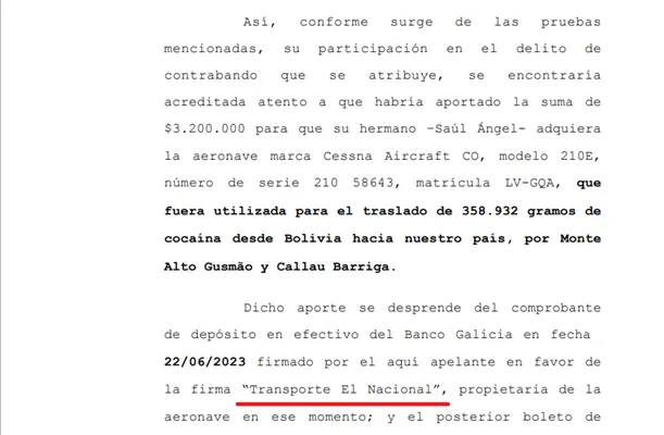Según un fallo de la cámara de Paraná, el avión se adquirió en el año 2023 mediante el pago de $5,7 millones otorgado en dos depósitos. El beneficiario de ese dinero fue la empresa “Transportes El Nacional S.A.”, de Alejandra Bada Vázquez, su hermano Vidal, y la esposa de éste María Roncero, socia de Ciccarelli, primo o testaferro de Fred Machado.