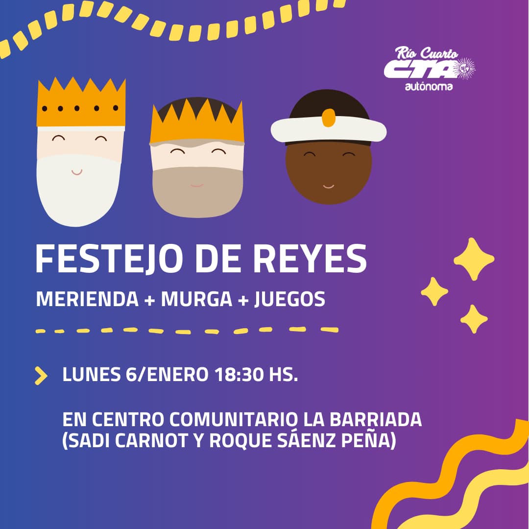 La CTA Autónoma Regional Río Cuarto llevará a cabo este lunes 6 de enero a partir de las 18.30 horas el Festejo de Reyes.