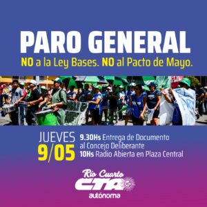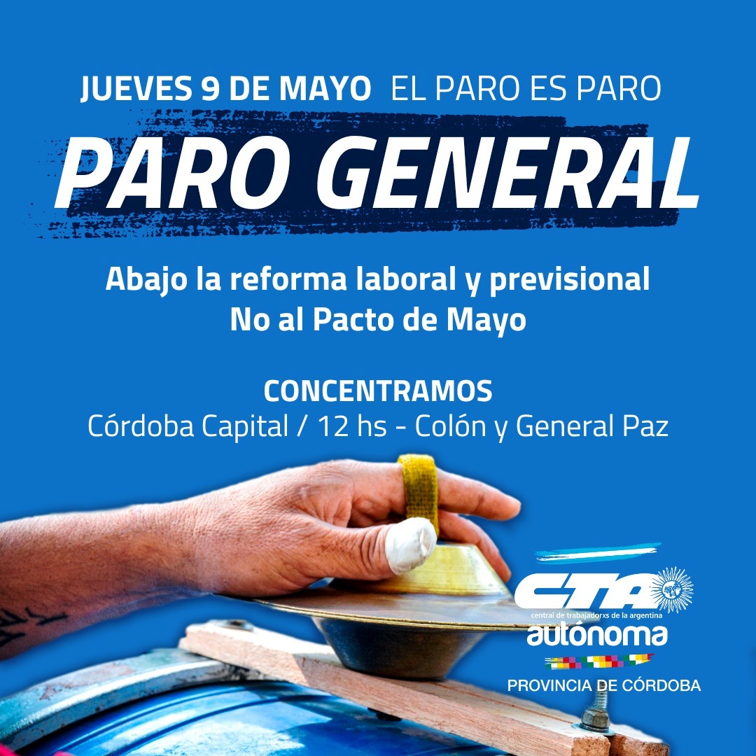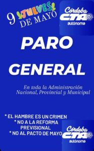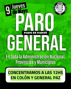 La CTA Autónoma junto a sus organizaciones de base (FeNaT; Cispren; Sindicato Joven CIS; SIPETACO; etc) y a estatales de todo el país, nacionales, provinciales y municipales, se suman este 9 de mayo al Paro General convocado por las centrales sindicales para detener el avance frontal del Gobierno de Javier Milei contra la clase trabajadora y el Estado.