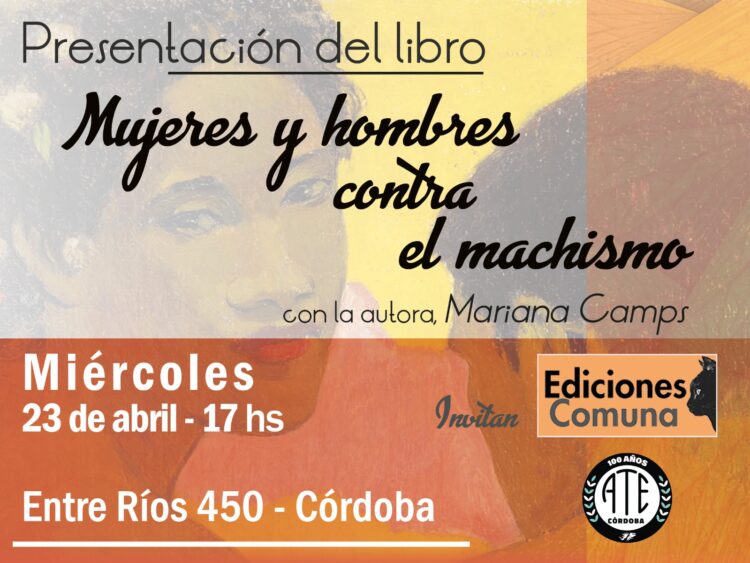Organizada por loa Secretaría de Cultura de ATE Córdoba, este miércoles 23 de abril, a las 17 horas, se realizará en el auditorio Héctor “La Perra” Castro, la presentación del libro “Hombres y Mujeres contra el machismo”, de la escritora Mariana Camps.