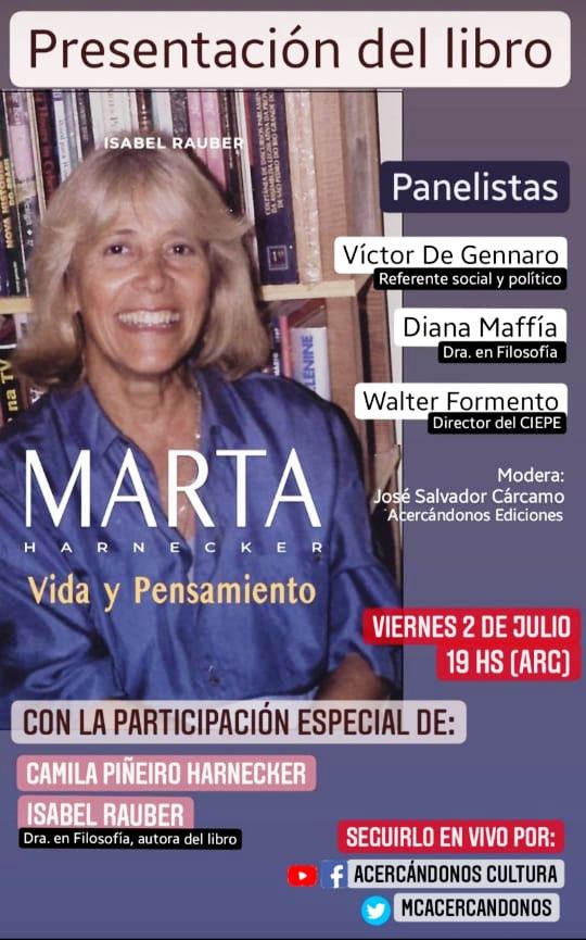 Este viernes 2 de julio a las 19 horas vía Zoom se presentará un nuevo libro de la Doctora en Filosofía Isabel Rauber titulado: “Marta Harnecker. Vida y pensamiento”.
