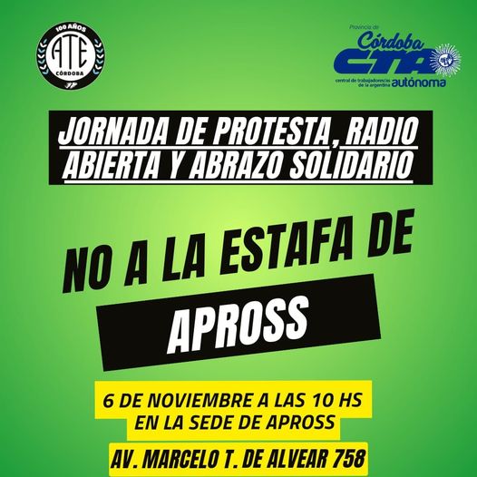 En cumplimiento a lo dispuesto en el Plenario General de Delegados del 25 de octubre, el Consejo Directivo Provincial (CDP) de ATE Córdoba convoca a movilizar este miércoles 6 de noviembre, a las 10 horas, a la sede de la Administración Provincial del Seguro de Salud (APROSS) en una en una Jornada de Protesta, con radio abierta y abrazo solidario.