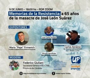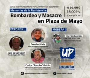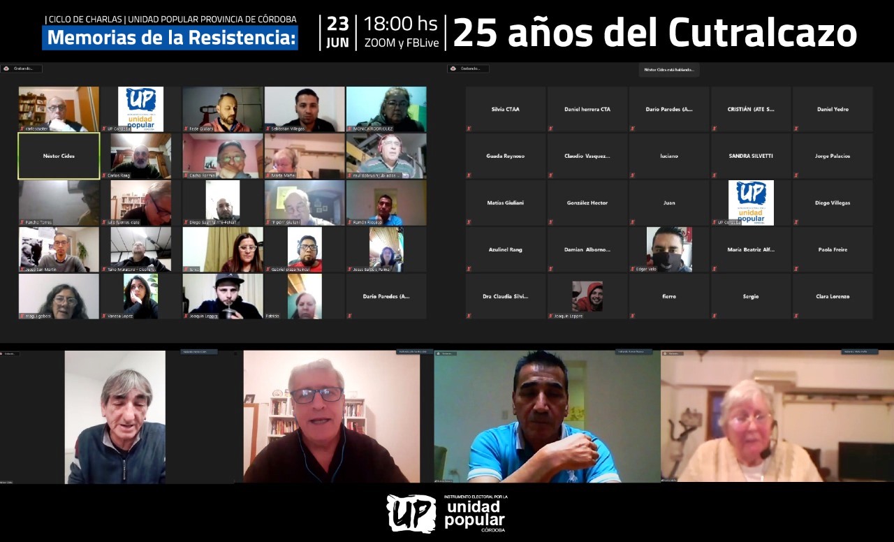 Con la coordinación de Federico Giuliani, Secretario General de ATE y la CTA Autónoma de la provincia de Córdoba, se llevó a cabo este miércoles 23 de junio -a 25 años del “Cutracalzo”- el Tercer Conversatorio vía Zoom organizado por el Instrumento Electoral por la Unidad Popular (UP) Córdoba bajo el lema “Memorias de la Resistencia”.
