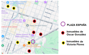Así vemos en el siguiente mapa, la ubicación de las mencionadas viviendas y cocheras con que cuenta “Tori” Flores, y las que están o estaban a nombre de Oscar González, que en estos momentos están siendo analizadas por la justicia federal. Todos ellos emulan una suerte de satélites que orbitan en ese cotizado círculo llamado Plaza España.